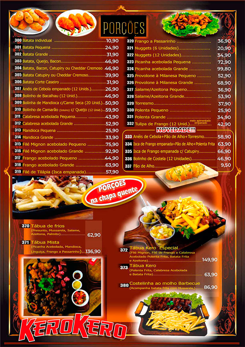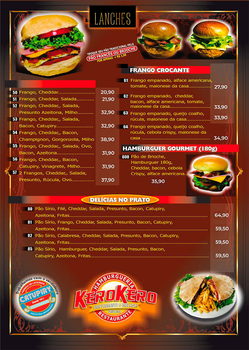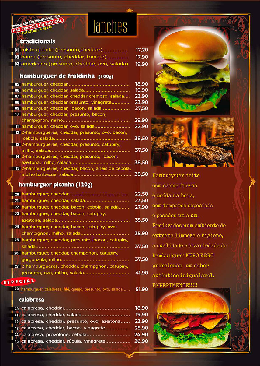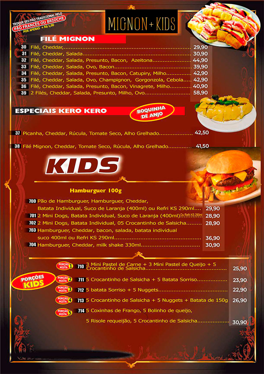 No Kero Kero Lanches você terá vários motivos para se deliciar com os produtos da casa. Com produtos de qualidade em um ambiente agradável, aproveite para saborear uma deliciosa Batata Grande com Bacon e Parmesão.Temos Lanches, sucos, porções servidas na chapa quente, saladas, petit gateau e muito mais. Também temos um espaço especial para seu filho, que conta com: Cama Elástica, Piscina de Bolinha, Gira-gira, Escorregador, Mesa para desenhar, Grama Sintética e muito mais...